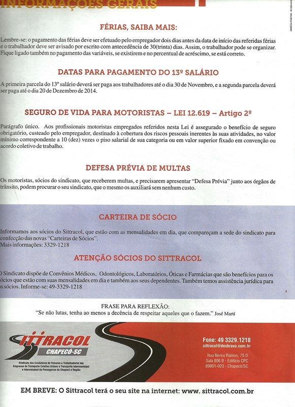 Leia o informativo do Sindicato dos Condutores de Veículos e Trabalhadores nas Empresa de Transportes Coletivos Urbano Interm. e Interestadual de Passageiros de Chapecó e RegiãO - SITTRACOL
